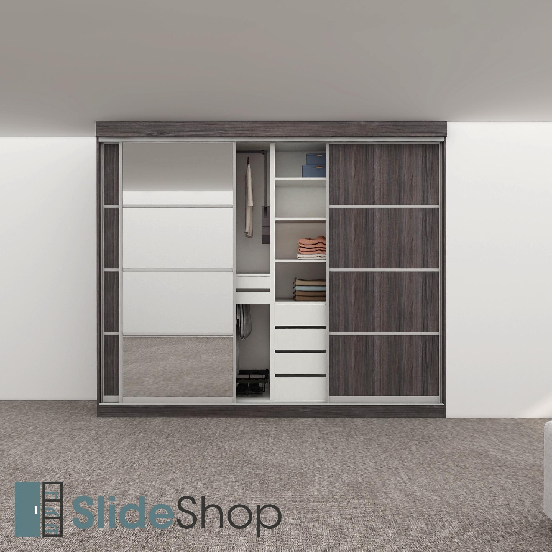 Vienna Series | Classic Sliding Door Wardrobe | W2840mm | Exterior boxing in Smoked Ash Timberland, carcass & back panel in warm white, doors in Smoked Ash Timberland, silver mirror.
