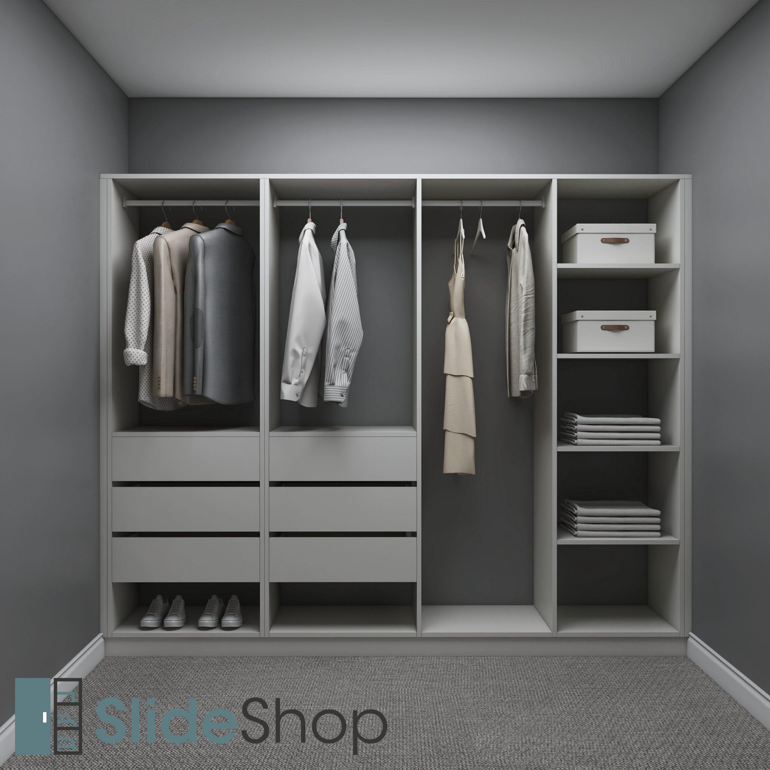 Introducing our Inifinite Series Wardrobe Organiser. Featuring a full bottom plinth, this wardrobe completes the modern look and makes storage look good. This design is equipped with adjustable shelves, drawers, and hanging functions Available in a wide range of colours and finishes.