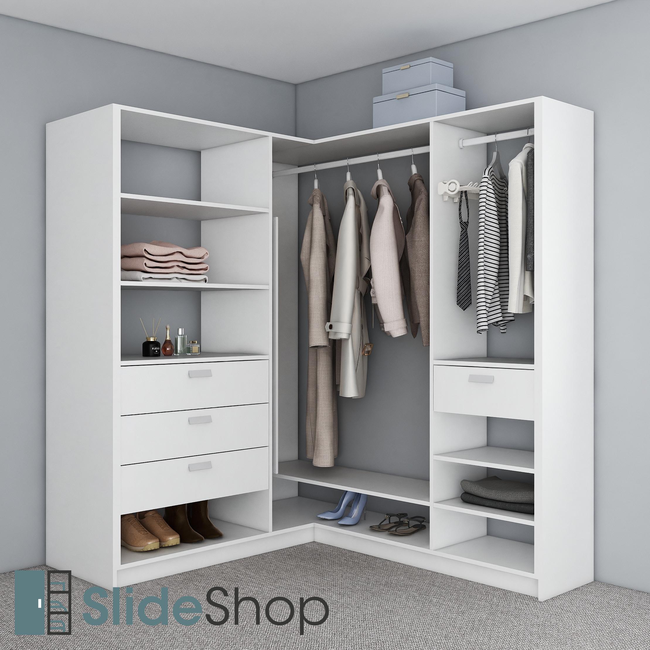 Suitable for corner spaces. Featuring corner long hanging. Left W800mm tower with adjustable shelving, 3 drawers, right W520mm tower with adjustable shelving, upper hanging, and 1 drawer.