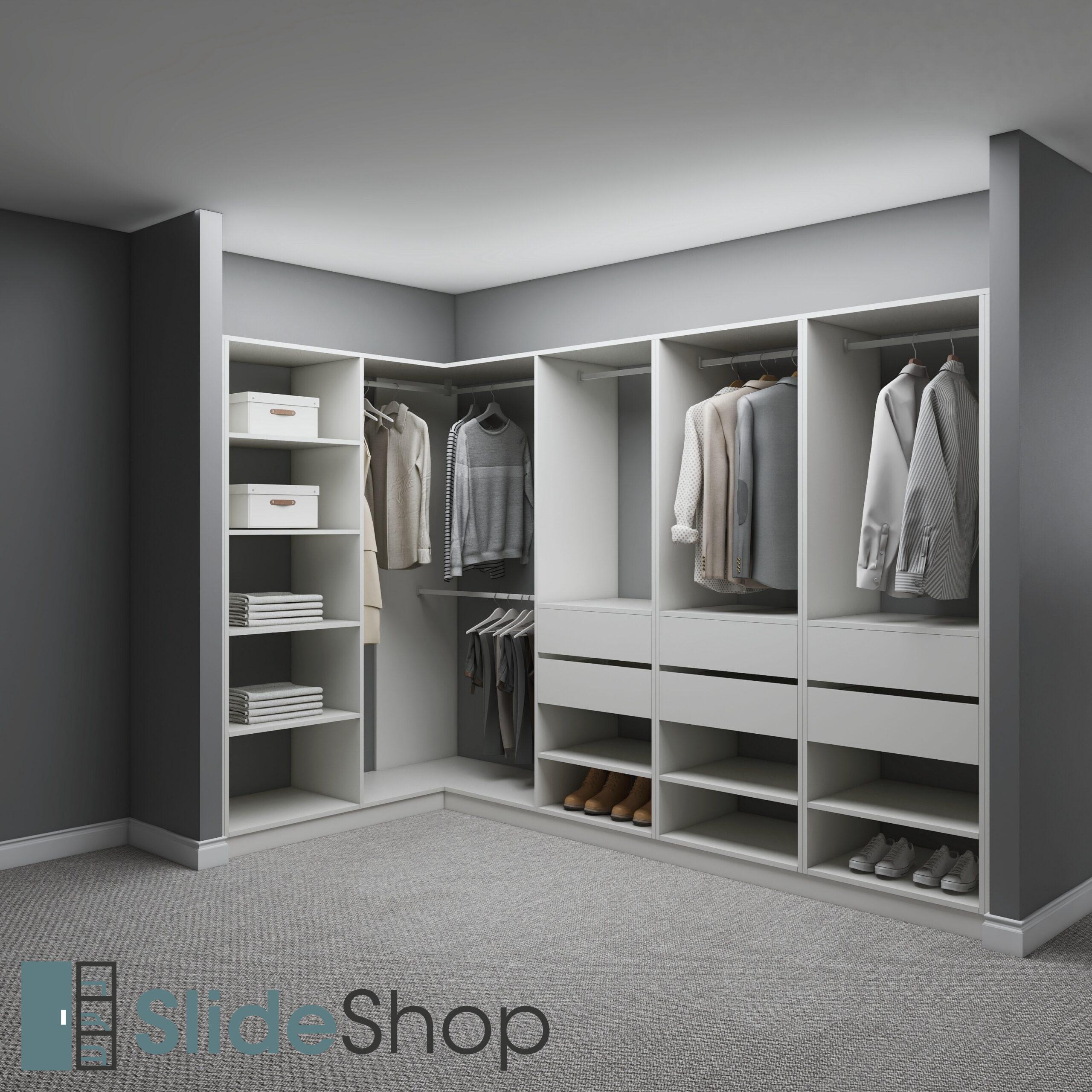 Suitable for corner spaces. Featuring corner long and short hanging. Left W800mm tower with adjustable shelving, right W800mm towers with 2 drawers each, upper hanging, and lower shoe storage.