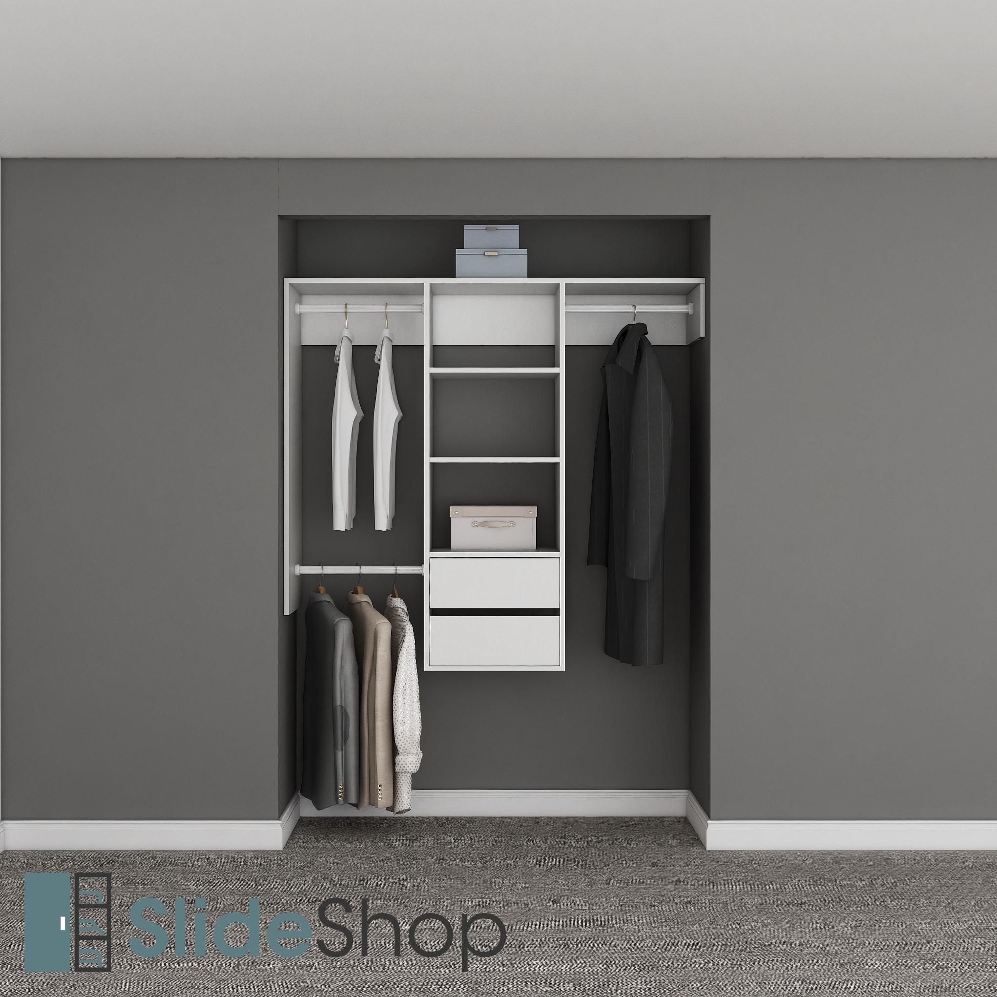 Left side with double hanging, right side with long hanging, middle tower with 2 drawers and adjustable shelving. Note: Length of overall top shelf affects the width of tower. Panels using 18mm melamine with 2mm edging Suitable for all built in wardrobe spaces. Hanging rails available in black or silver. H1400mm | Please ensure to measure your wardrobe space accurately before placing an order, and allow for 3-5 working days for manufacturing. For delivery options and installation please contact us for a quote. Pickup at our location: 79 Ellice Rd, Wairau Valley Auckland. Our factory shop operates from Monday to Friday, 09:00 am to 5:30 pm, and Saturday from 10:00 am to 3:00 pm, closed on Sundays and public holidays.