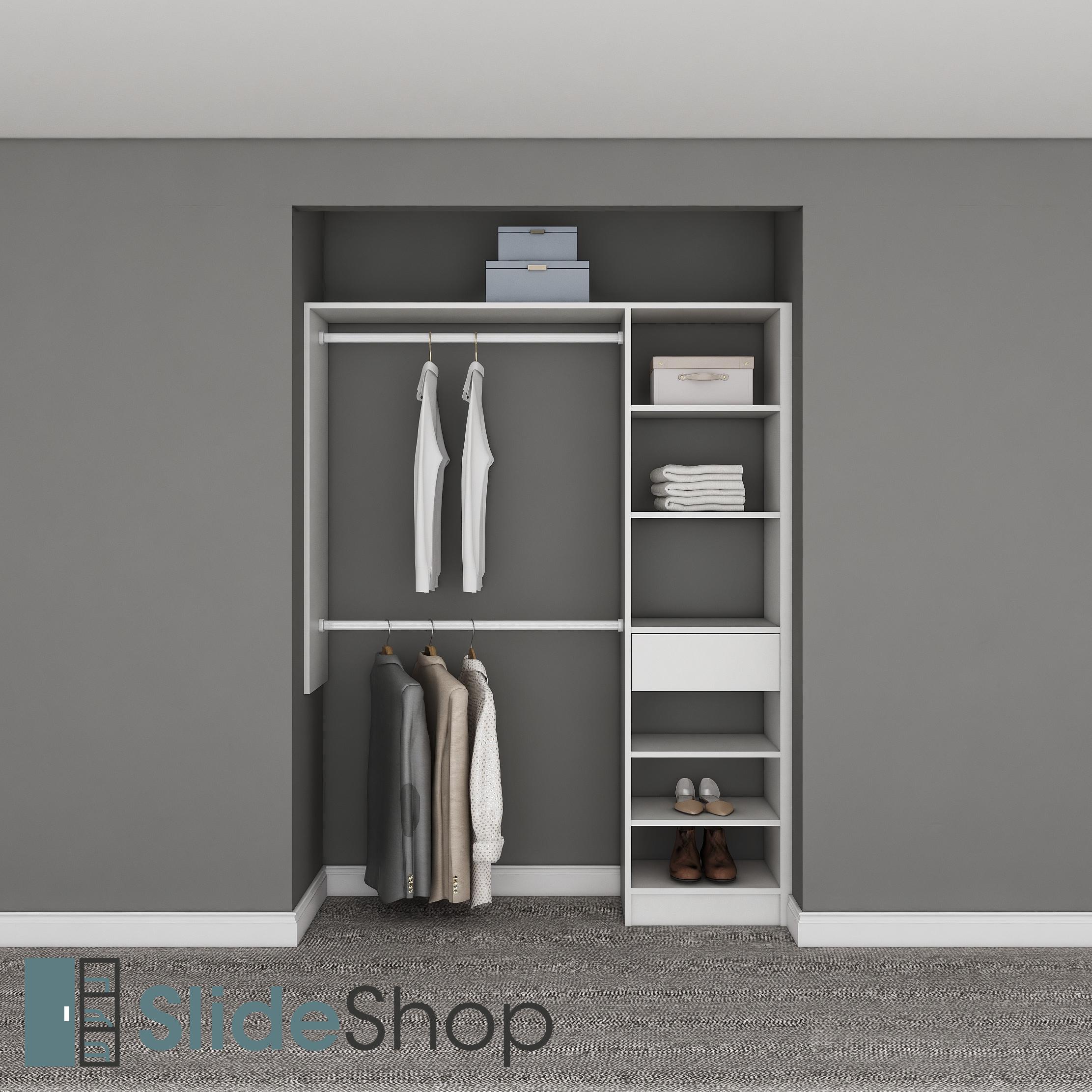 Left side double hanging, right tower with adjustable shelving, 1 drawer. Note: Length of overall top shelf affects the width of tower. Panels using 18mm melamine with 2mm edging Suitable for all built in wardrobe spaces. Hanging rails available in black or silver. H1958mm | For this style, we recommend door opening heights to be more than H2200mm. Please ensure to measure your wardrobe space accurately before placing an order. For delivery options and installation please contact us for a quote. Pickup at our location: 79 Ellice Rd, Wairau Valley Auckland. Our factory shop operates from Monday to Friday, 09:00 am to 5:30 pm, and Saturday from 10:00 am to 3:00 pm, closed on Sundays and public holidays.