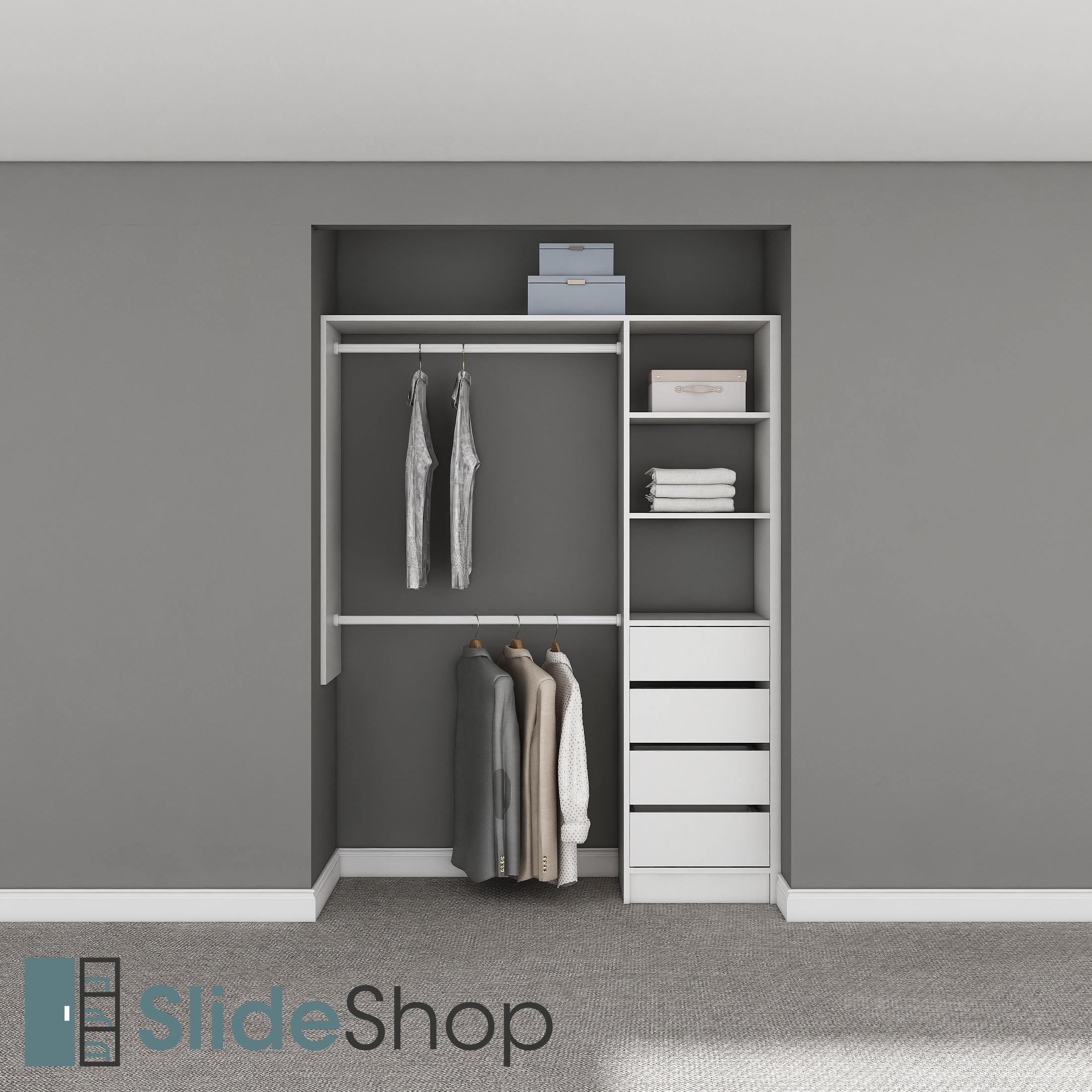 Left side double hanging, right tower with adjustable shelving, 4 drawers.