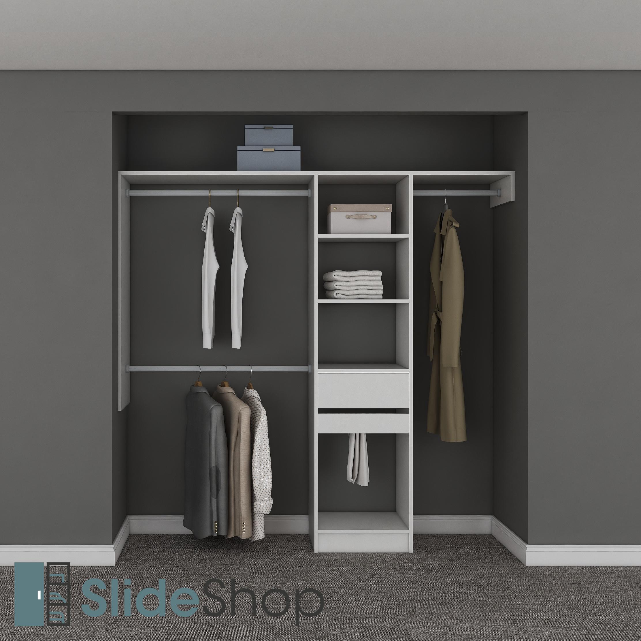 Left side double hanging, right side long hanging. Middle tower with adjustable shelving, 1 drawer and trouser rack.