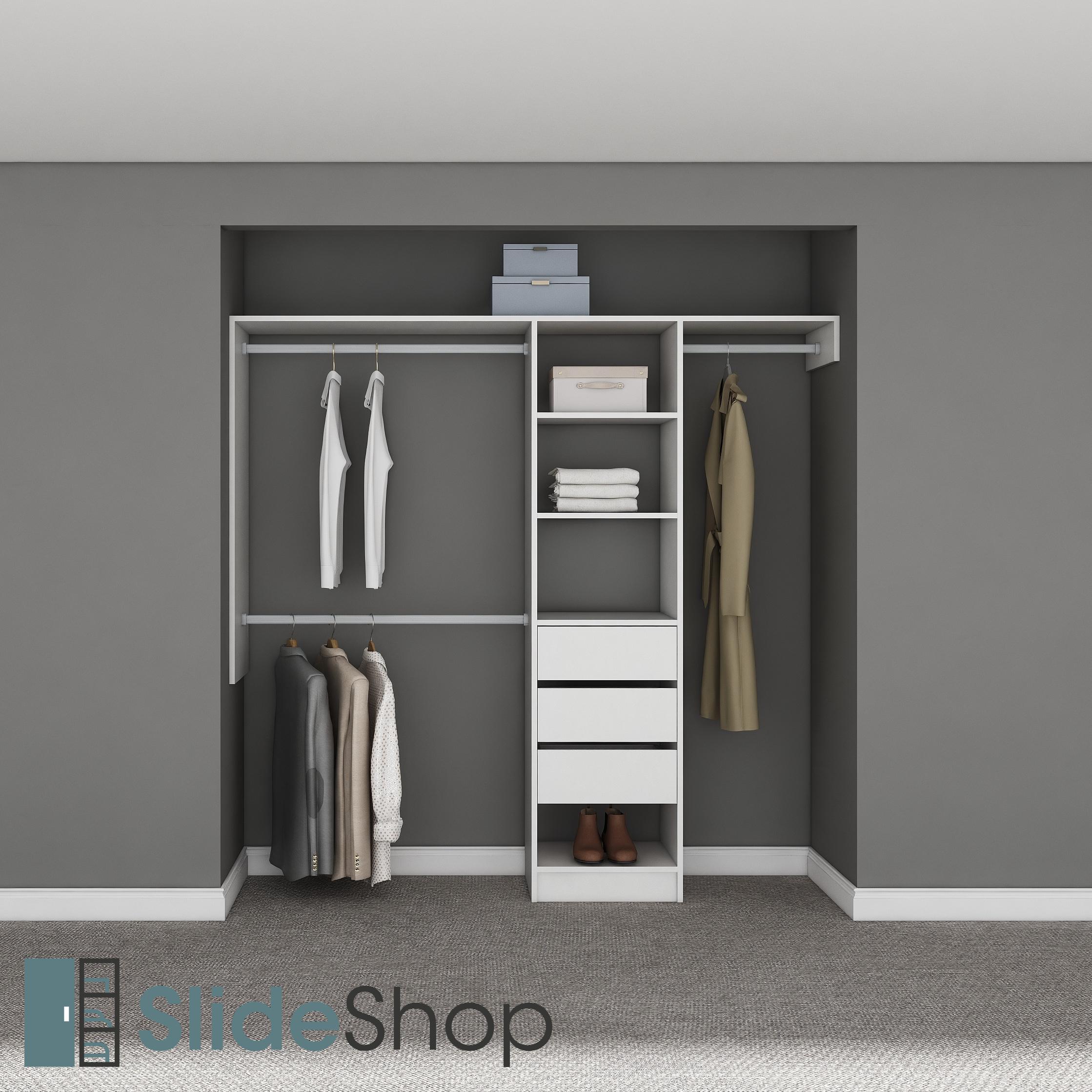 Left side double hanging, right side long hanging. Middle tower with adjustable shelving, 3 drawers. Note: Length of overall top shelf affects the width of tower. Panels using 18mm melamine with 2mm edging Suitable for all built in wardrobe spaces. Hanging rails available in black or silver. H1958mm | For this style, we recommend door opening heights to be more than H2200mm. Please ensure to measure your wardrobe space accurately before placing an order. For delivery options and installation please contact us for a quote. Pickup at our location: 79 Ellice Rd, Wairau Valley Auckland. Our factory shop operates from Monday to Friday, 09:00 am to 5:30 pm, and Saturday from 10:00 am to 3:00 pm, closed on Sundays and public holidays.