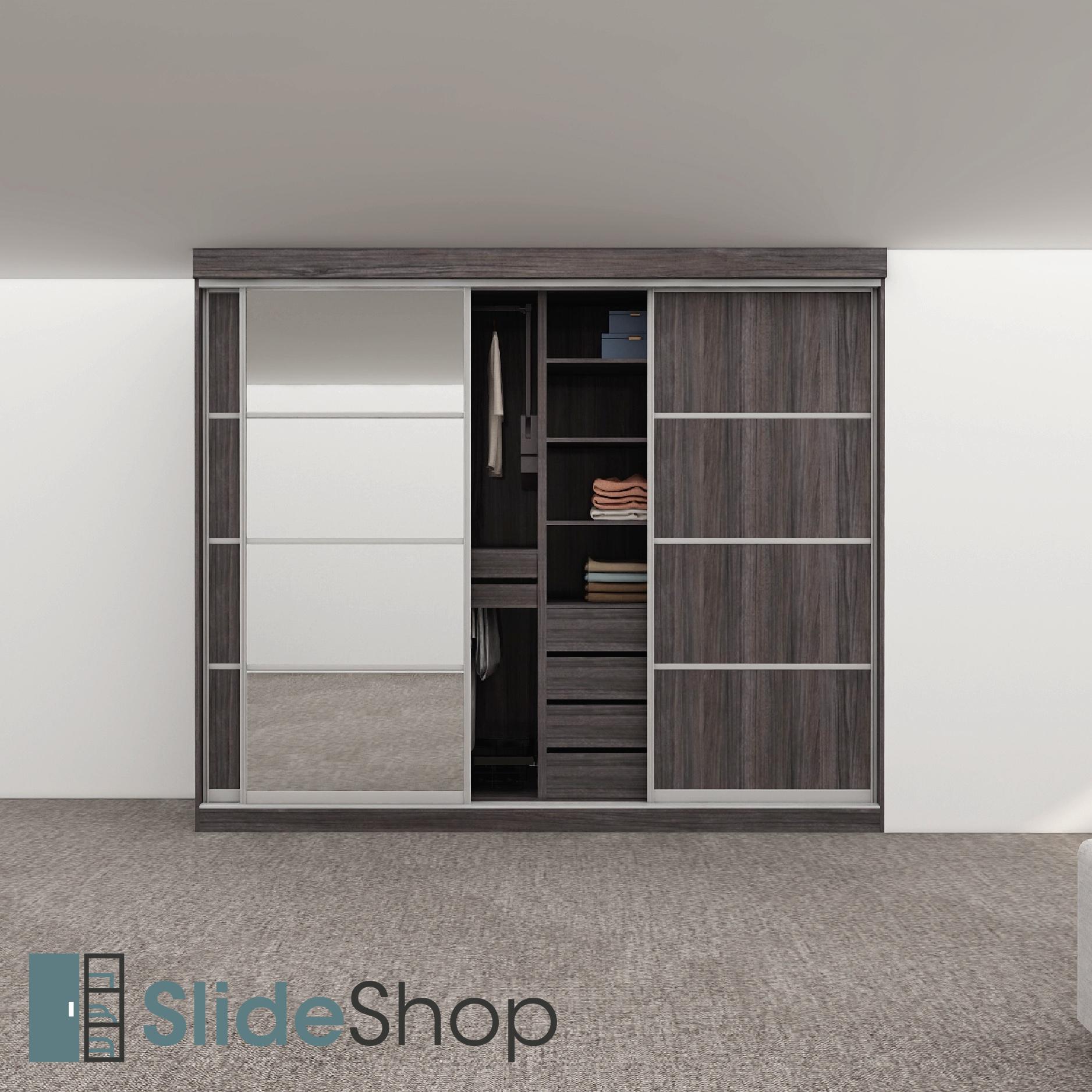 Vienna Series | Classic Sliding Door Wardrobe | W2840mm | Exterior boxing, carcass & back panel in Smoked Ash Timberland, doors in Smoked Ash Timberland, silver mirror.