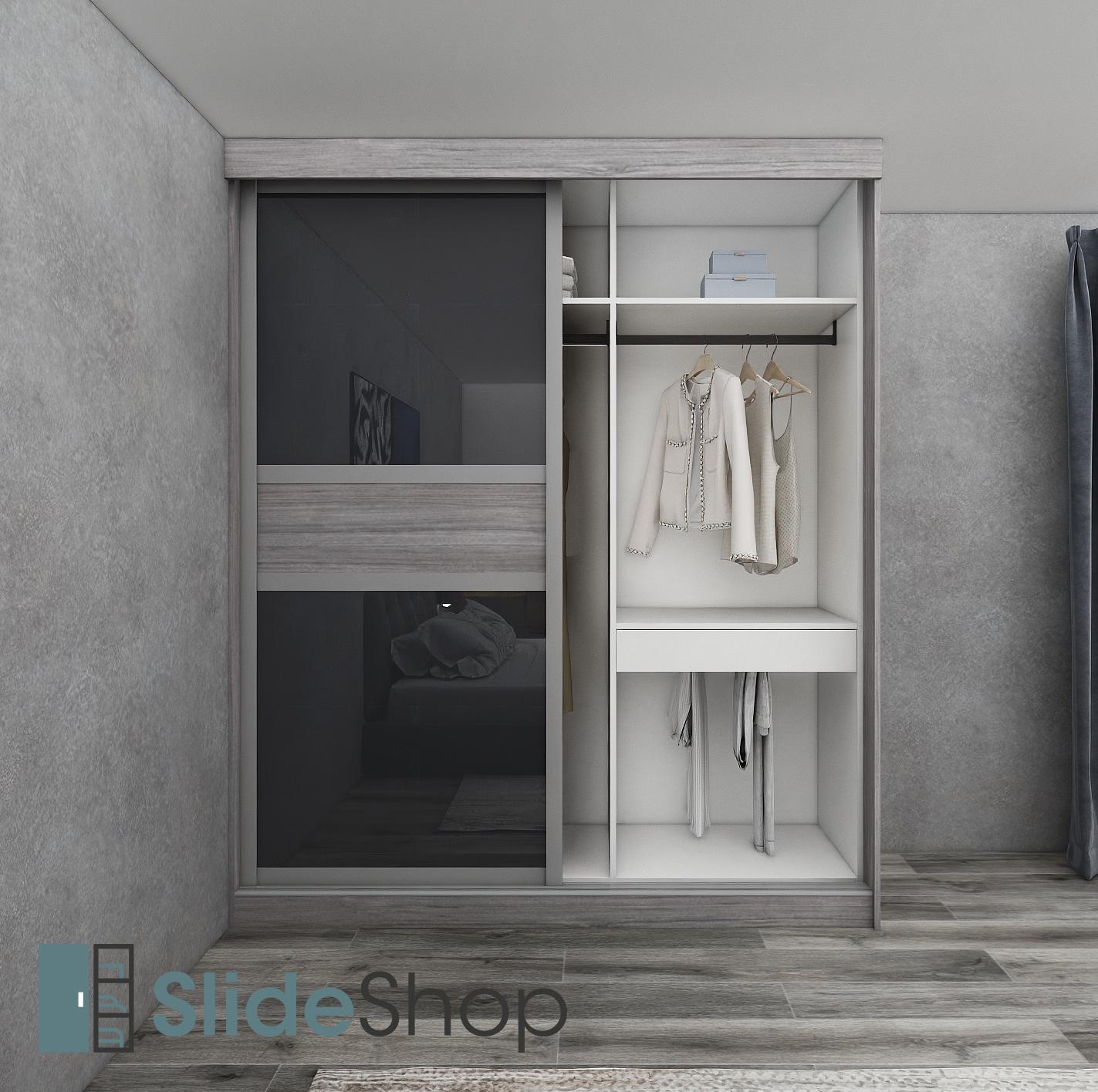 Vienna Series | Urban Double Sliding Door Wardrobe | W1950mm | Exterior boxing in Smoked Ash Timberland, carcass & back panel in warm white naturale, doors in Smoked Ash Timberland & smokey mirror.