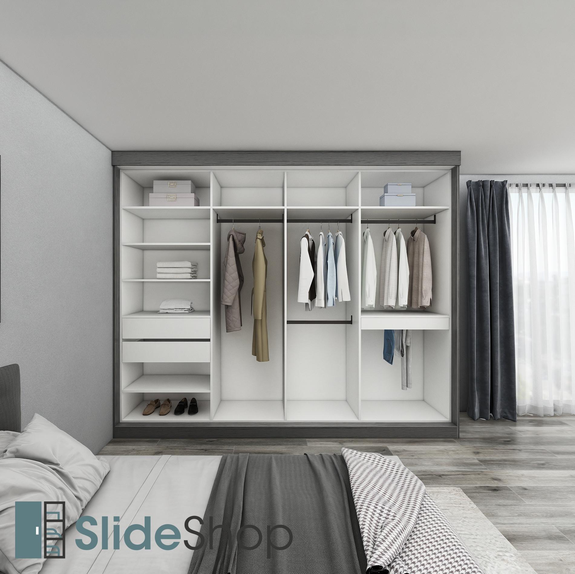 Overall height 2400mm. Width 2900mm. Carcass depth 520mm, overall depth 650mm, (handle option depth is 690mm). Sliding doors 3 x Urban Single 2 Equal Division style. Featuring drawer storage and Unihopper pull out trouser rack.