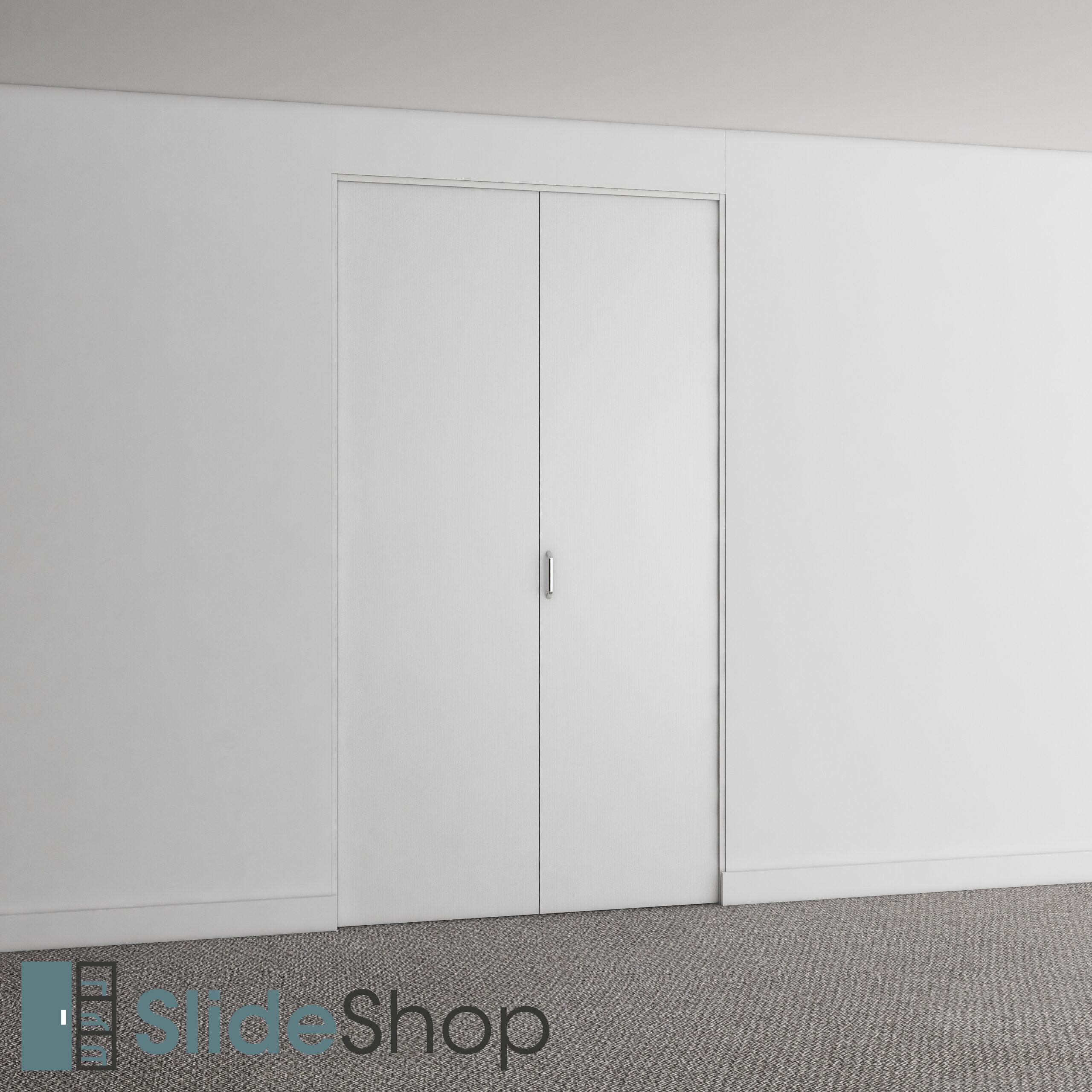 Custom-made set of bi-folding doors in melamine and aluminium soft-closing top track. Height up to 2400mm.